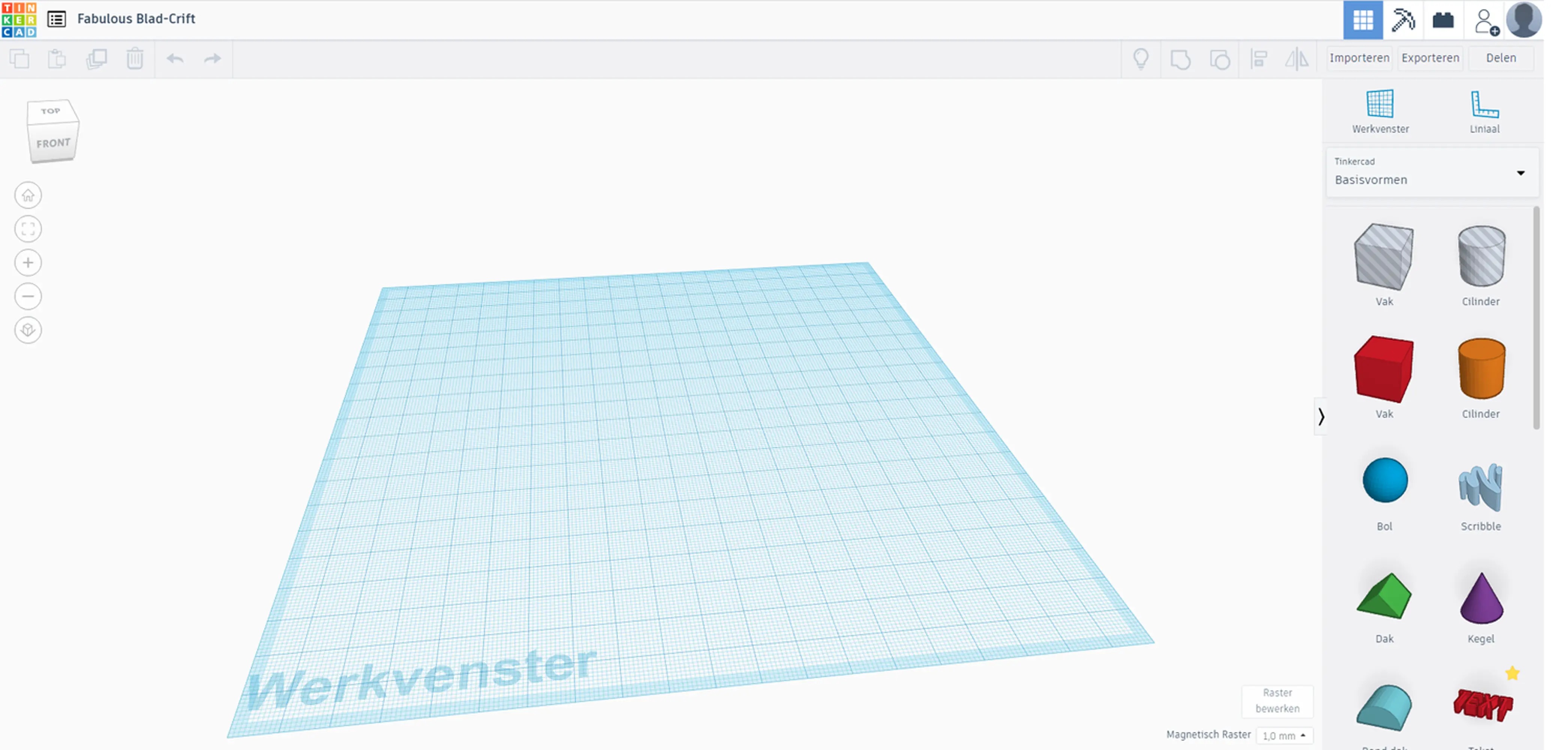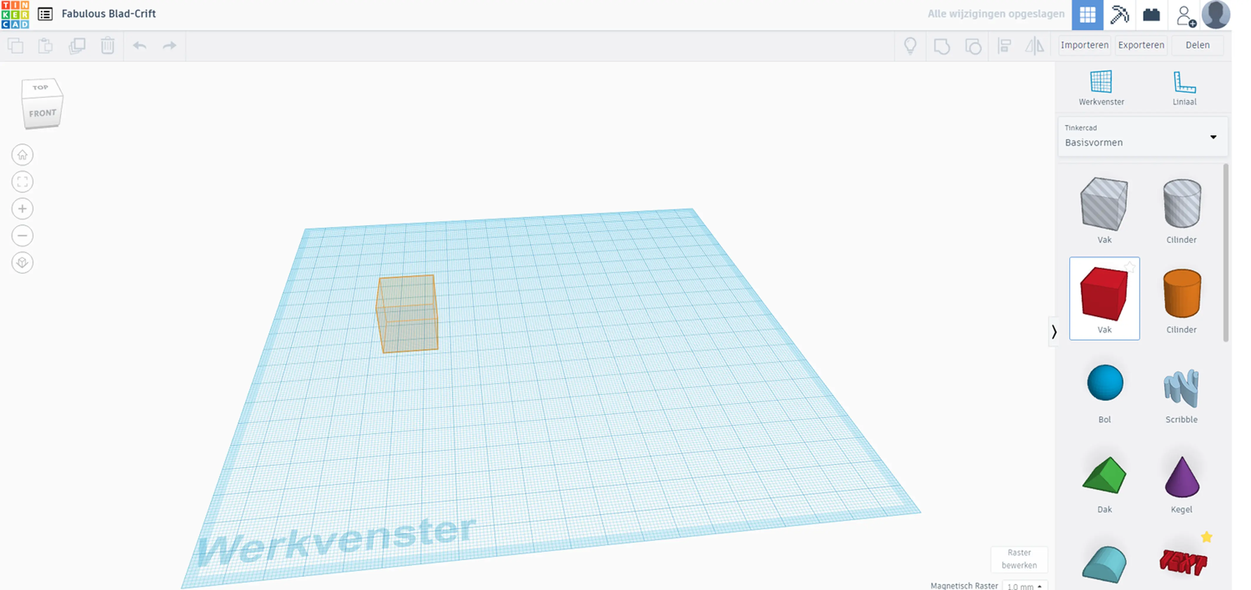 Aan de rechterkant zie je een menu met allerlei verschillende vormen. We beginnen met de rode kubus en slepen deze in het veld.