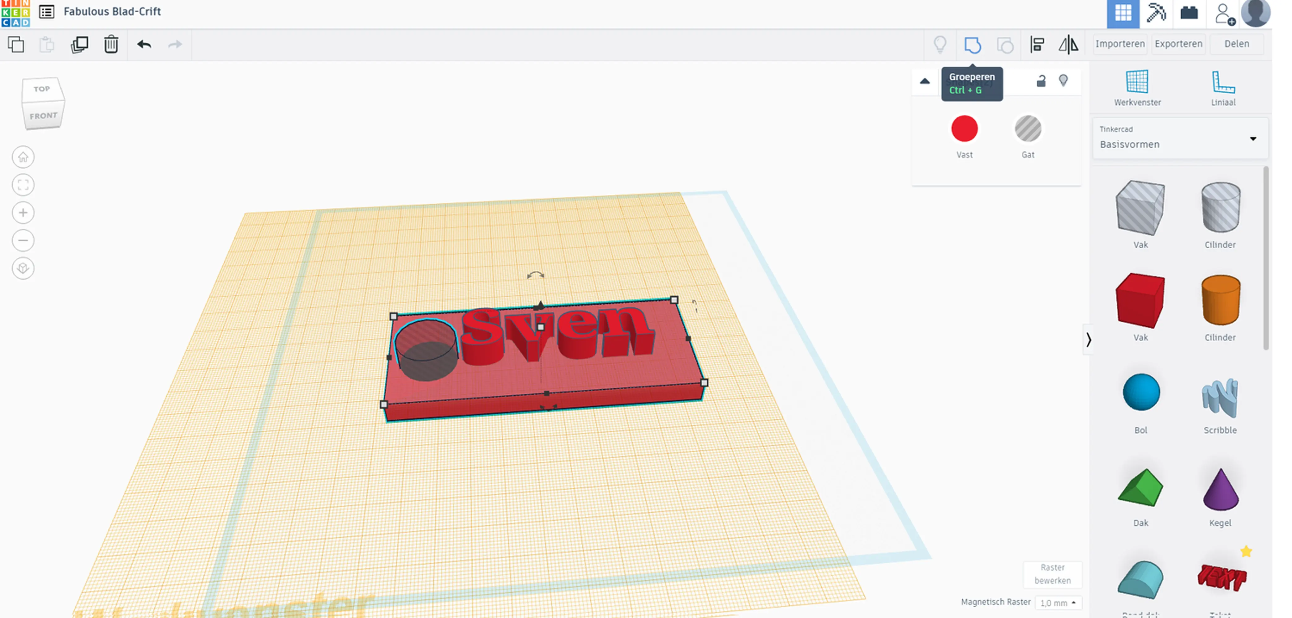 Als laatste gaan we het gat echt maken. Dan doen we door de toets Shift ingedrukt te houden. Daarna klikken we de cilinder en de rechthoek. Wanneer deze beide zijn geselecteerd kunnen we de toetsencombinatie CTRL+G gebruiken of rechtsboven het knopje groeperen aan te klikken.