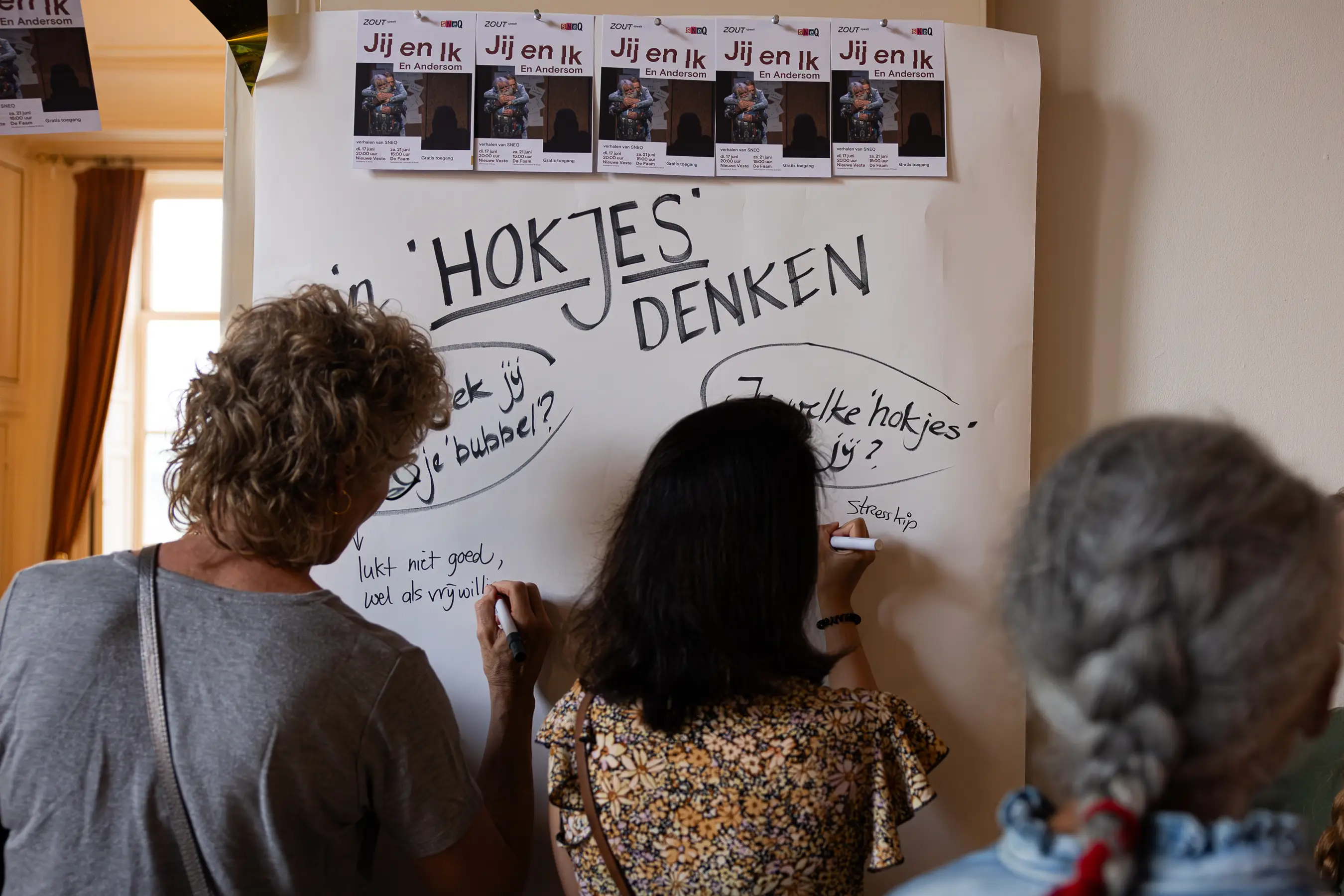 ‘Jij en Ik En Andersom’ gaat ook over hulp krijgen en geven. Paulina: “We kregen huiswerk mee van Letizia, de regisseuse. Ik moest een liedje zoeken over hulp, en er een gedicht over schrijven. Dat was super reflectief. Ik bedacht me dat mijn hele leven draait om helpen en geholpen worden. Daar had ik nooit zo over nagedacht.” SNEQ is een ideale omgeving om dat te helpen doorbreken, is haar onderliggende boodschap.